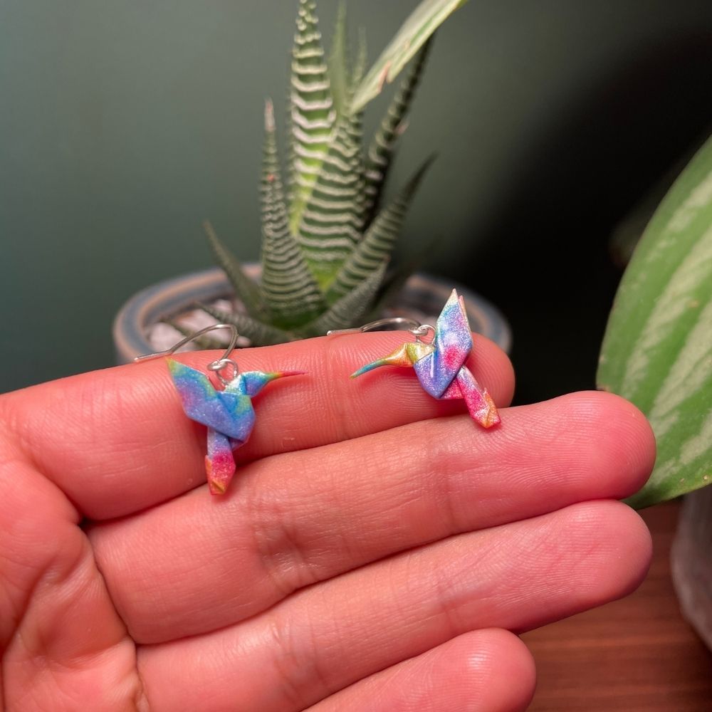 Los aretes colgantes colibrà en origami, elaborados artesanalmente por IMAGIRO en Bogotá, son una expresión de delicadeza y movimiento transformada en joyerÃa artesanal única. El colibrÃ, un modelo tradicional de origami, simboliza la alegrÃa, la libertad y la energÃa vital, convirtiéndose en un accesorio lleno de significado.