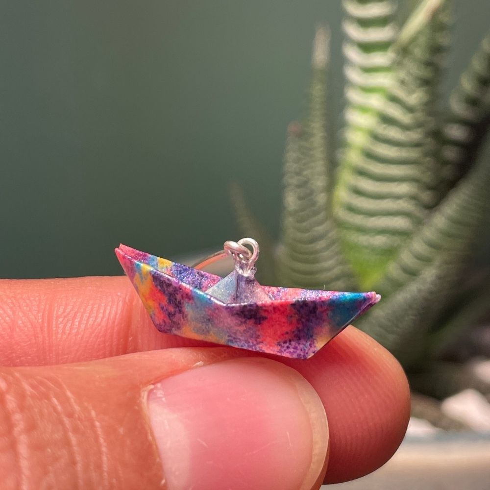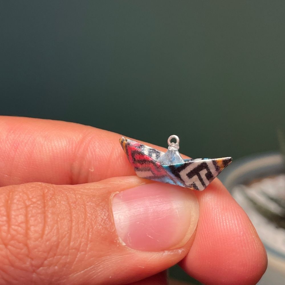 Los aretes colgantes barco en origami, elaborados artesanalmente por IMAGIRO en Bogotá, transforman un modelo tradicional del origami japonés en una pieza de joyerÃa artesanal moderna y única. El barco es un sÃmbolo de viajes, sueños y nuevas aventuras, convirtiéndose en un accesorio con gran significado personal.