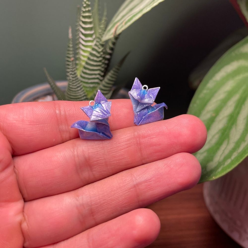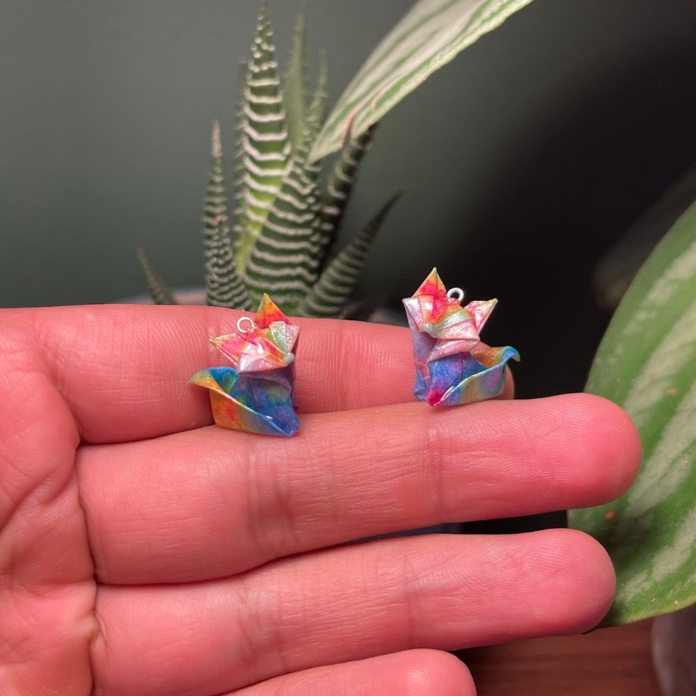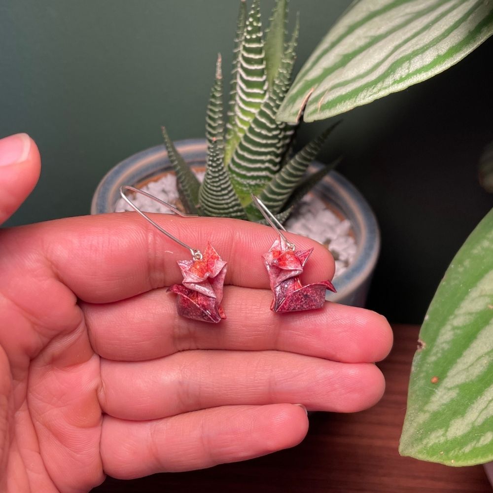 Cada par está hecho a mano con papel especial para origami, protegido con un recubrimiento impermeable que asegura su durabilidad, ligereza y resistencia al uso diario. Los herrajes en plata 9.50 aportan un acabado brillante, elegante e hipoalergénico, ideal para quienes buscan un accesorio distintivo y de calidad.